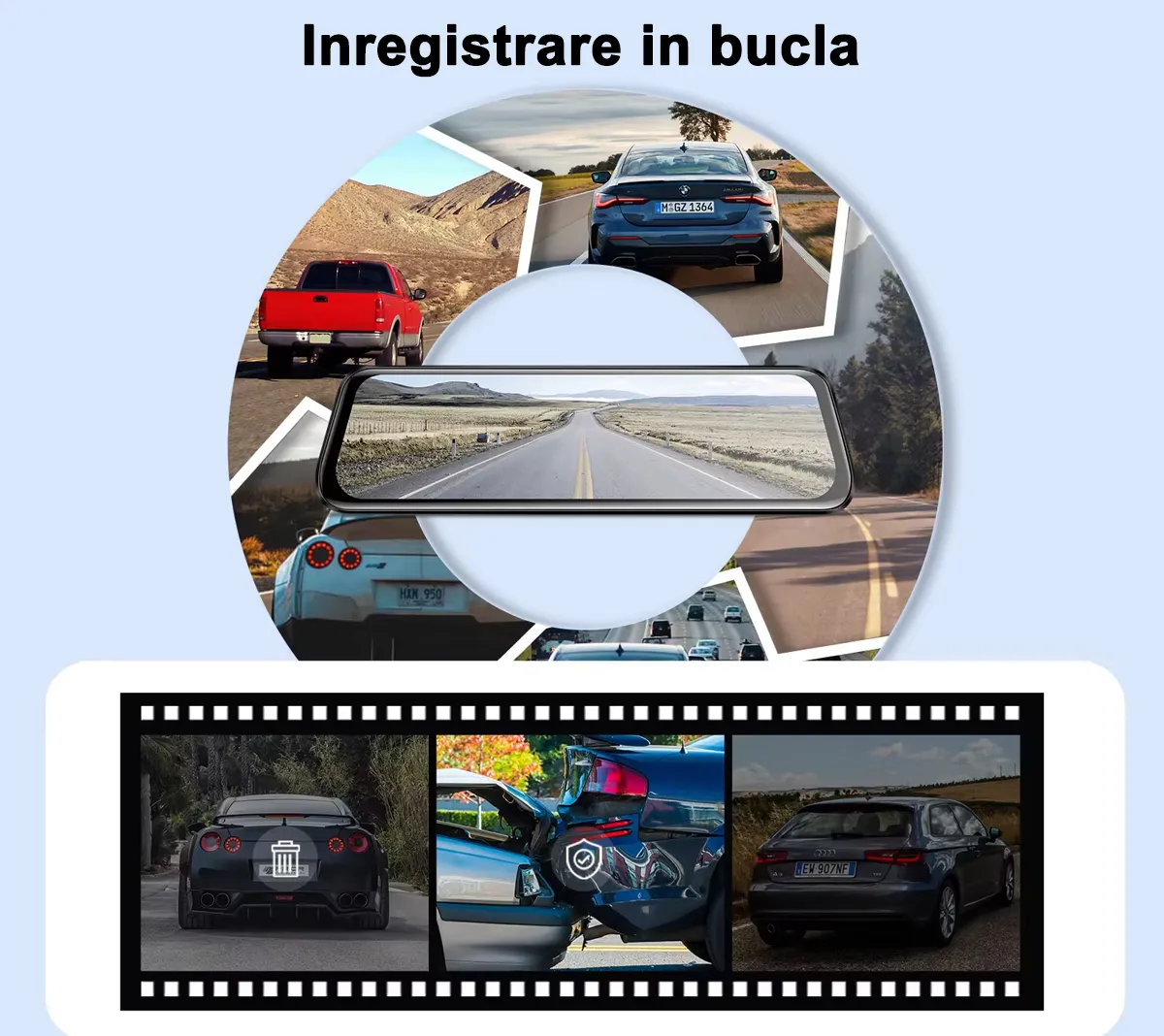 AZDOME AR09 WiFi este o camera de bord cu 2 canale cu design unic si poate fi plasata peste orice oglindta interioara cu ajutorul suporturilor de cauciuc incluse. Datorita ecranului LCD cu ecran tactil mare, de 9.66", formeaza o oglinda interioara digitala de inalta calitate. Camera din spate este afisata complet si foarte clar pe ecranul mare si cu o singura gilsare pe ecran puteti comuta intre camera frontala si cea din spate.