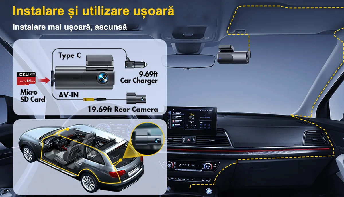 Dimensiune compacta si instalare usoara - aceasta camera de bord cu interfata de tip C are o dimensiune foarte compacta care nu va afecteaza vederea cand conduceti. Instalarea si demontarea camerei de bord din partea din fata a masinii se face fara efort datorita designului detasabil si functiei reglabile la 120°. in plus, camera din spate este reglabila la 360° si poate fi pozitionata oriunde in masina, oferind o flexibilitate completa.