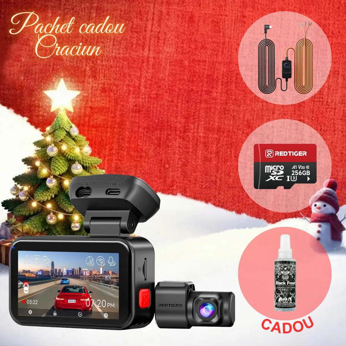 Pachet Cadou Craciun REDTIGER ViewClear 70 4K+2.5K, WiFi, Night Vision Color, ecran tactil 3”, GPS