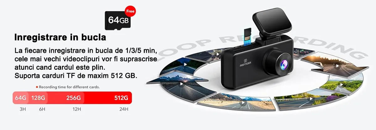 Camera vine cu un card TF de 64GB inclus. Capacitatea maxima a cardurilor TF compatibile este de 512GB (NU este inclus).