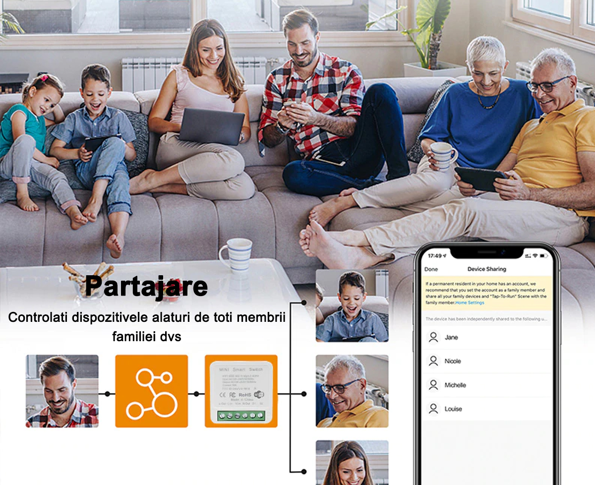 De asemenea, accepta sincronizarea pornirii/opririi aparatelor la o ora specificata si partajarea cu alte persoane pentru a putea controla dispozitivele cu ceilalti membrii ai familiei.