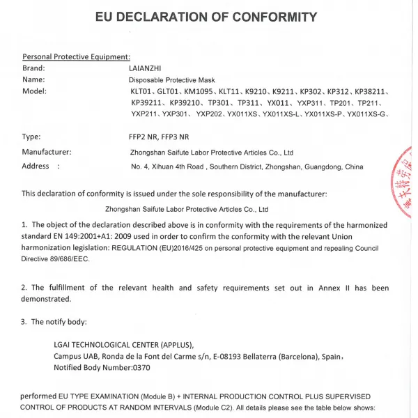 Mastile sunt realizate in conformitate cu standardele EN 149:2001 + A1:2009 si CE 0370.