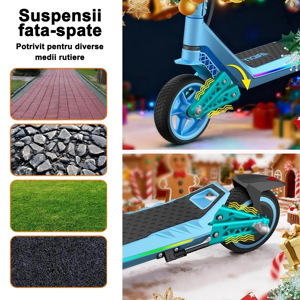 Trotineta electrica RYDE U8 este special conceputa pentru copiii cu varsta intre 6 si 12 ani, oferind un echilibru excelent intre distractie, control si siguranta. Cu viteza limitata la maximum 16 km/h (are 3 viteze si merge in functie de setare cu 8 / 12 / 16 km/h) si structura ranforsata, este ideala pentru invatare progresiva si utilizare sub supravegherea adultilor, in parc sau pe alei.